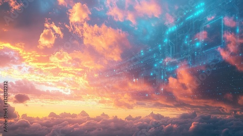 Fototapeta premium Sunset sky with subtle glowing circuits blending smoothly with the clouds...
