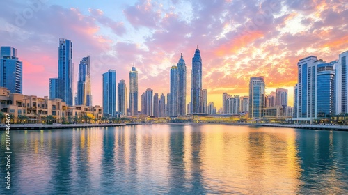 © Daisha, Fototapeta premium Sunset Skyline Cityscape Reflection