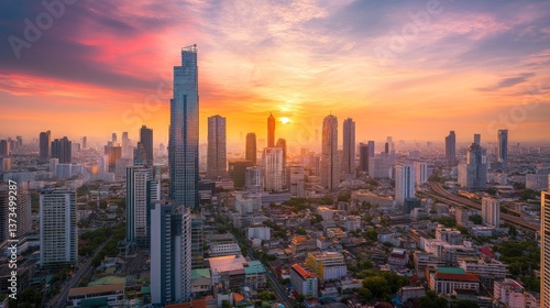 Obraz premium Sunset skyscrapers overlooking urban landscape bangkok cityscape photography...