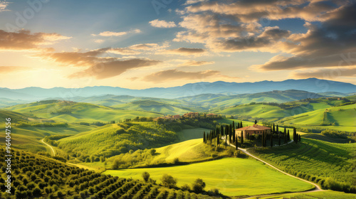 © evening_tao, Naklejka premium Sunset Splendor over Tuscan Hills