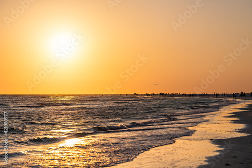 © Andriy Blokhin, Fototapeta premium Sunset sun above horizon in Siesta Key, Florida at Sarasota, USA with coast ocean Gulf of Mexico, silhouettes of distant people in far distance walking on beach