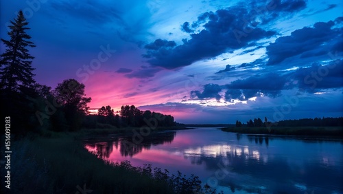 © Luckystation, Fototapeta premium Sunset Symphony: A tranquil lake reflects a breathtaking canvas of colors painted across the sky, with shades of pink, purple, and blue creating a mesmerizing symphony of light and serenity.