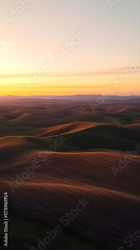 Naklejka premium Sunset Symphony Over Rolling Hills: A Dance of Light and Shadow Across Verdant and Golden Fields Under a Painted Sky