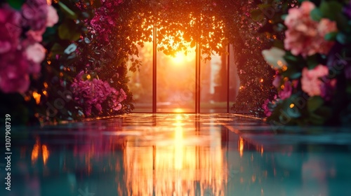Naklejka premium Sunset through a floral archway, reflecting on the still water below. A...