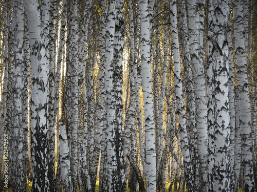 © ss404045, Fototapeta premium Sunset through autumn birch forest. Texture of birch trunks, solid forest.