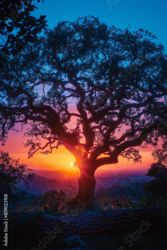 Obraz premium Sunset through the branches of an old oak, sky in a gradient from soft lavender to dark blue,
