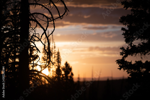 © Benjamin, Fototapeta premium Sunset through the trees in medicine bow mountain