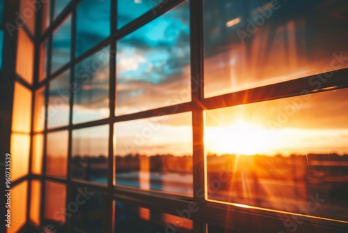 Fototapeta premium Sunset through the window of an office building, silhouette, high-rise buildings in the distance, corporate head office.