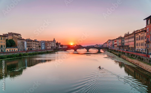Obraz premium Sunset time in Florence, Italy. Bright sky over Arno river and medieval bridge.