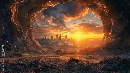 Fototapeta premium Sunset view from a cave revealing a futuristic city skyline in the distance