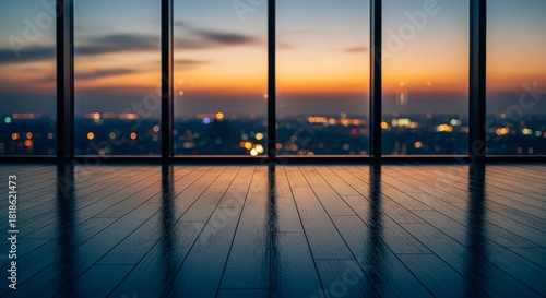 Obraz premium Sunset view from a high rise apartment with a reflective wooden floor surface