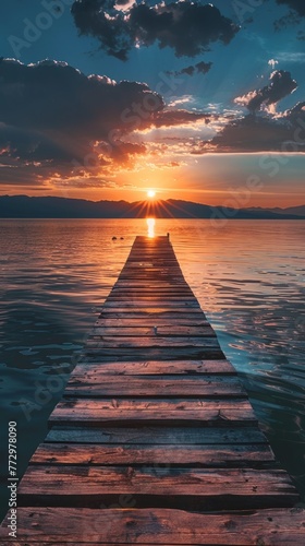Obraz premium Sunset view from a wooden pier over a calm lake