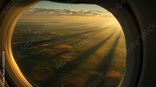 © nabila, Fototapeta premium Sunset View from Airplane Window Over Countryside Landscape