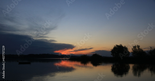 Fototapeta premium Sunset view from Auslikon, Wetzikon. Bright red sky and shore of Lake Pfaeffikon, Zurich Canton, Switzerland.
