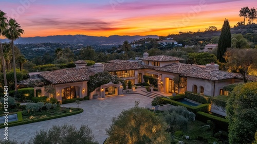 © Egriva, Fototapeta premium Sunset view, luxury mansion, hillside estate, aerial, real estate