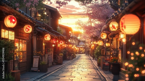 Fototapeta premium Sunset view of a Japanese street lined with traditional buildings, cherry blossoms, and paper lanterns.