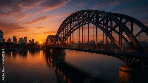 © Rishushi, Naklejka premium Sunset View of Arch Bridge over River with City Skyline