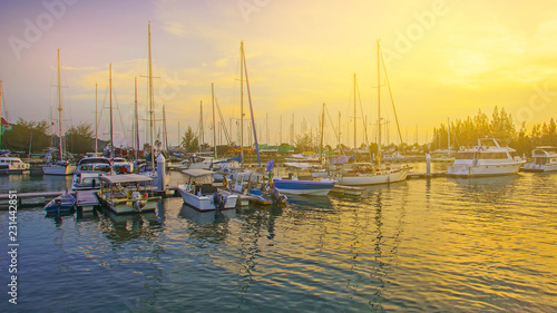 © nelzajamal, Fototapeta premium Sunset view of beautiful yatch at harbour.
