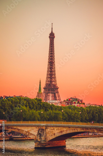 Naklejka premium Sunset view of Eiffel Tower and river Seine in Paris, France.