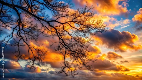 © suchetpong, Fototapeta premium Sunset view of macro clouds behind a branch of a tree in autumn