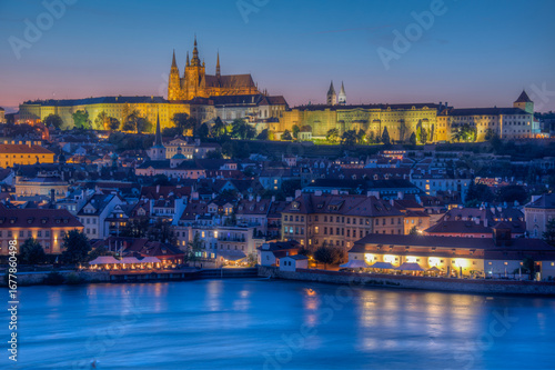 © dudlajzov, Obraz premium Sunset view of people passing Charles bridge towards Prague cast