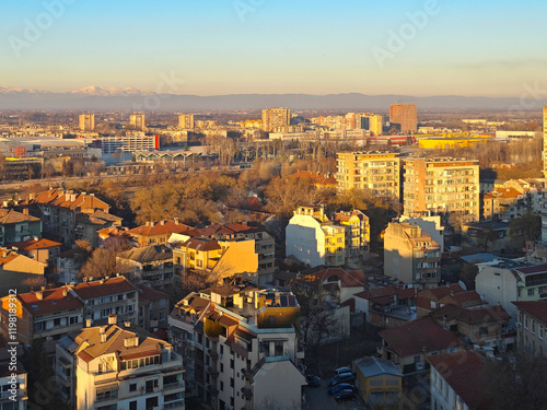 Fototapeta premium Sunset view of Plovdiv city from Nebet Tepe hill, Bulgaria