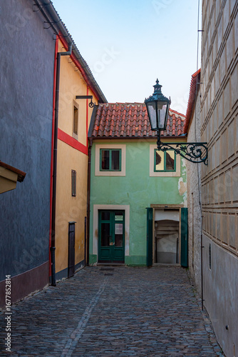 Fototapeta premium Sunset view of The golden lane at the Prague castle, Czech repub