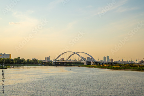 © Анастасия Бурлакова, Naklejka premium Sunset view over a river with a modern steel arch bridge and city skyline in the background. Astana, Kazakhstan, Argar Bridge over the Ishim River