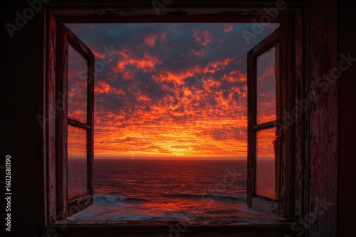 © Firmantio, Fototapeta premium Sunset view through weathered window
