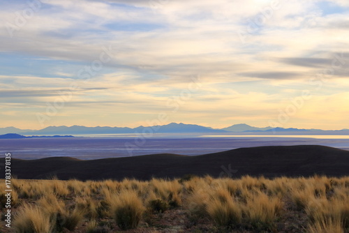 Obraz premium sunset view to the Salar de Uyuni Salt Flats in Bolivia from a viewpoint near...