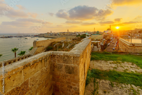 Fototapeta premium Sunset view with skyline, walls and fishing port, in Acre