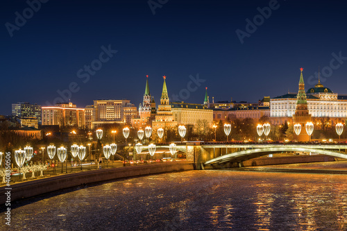© Neonyn, Naklejka premium Sunset vinter view of Temple of Christ Savior with Christmas decorations, Moscow, Russia.