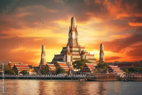 Obraz premium Sunset Wat Arun Ratchawararam Ratchaworamahawihan, Bangkok, Thailand, on the banks of the Chao Phraya River with Ai Generated