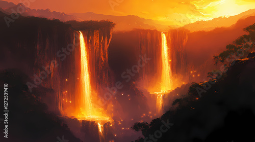 © Thiago, Fototapeta premium sunset waterfalls two grand towering cliffs