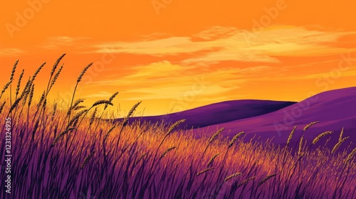 © Chaikit, Obraz premium sunset wheat field landscape, golden hour glow, wispy cloud formations, rolling purple hills, orange sky gradient, silhouetted grain stalks, tranquil rural scene, soft pastel horizon