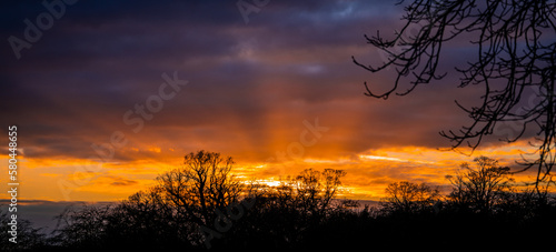 © Dave Bonehill, Obraz premium sunset with god rays behind trees