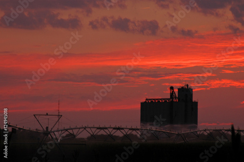 © Jana, Fototapeta premium Sunset with Grain Elevator and Irrigation Pivot
