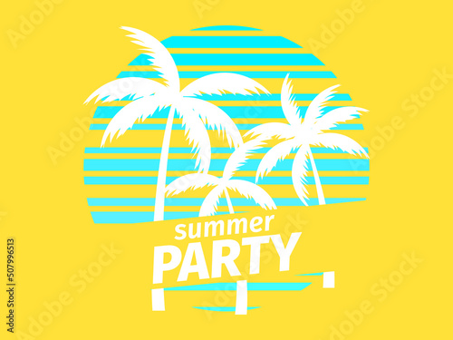 Naklejka premium Sunset with palm trees in 80s style. Summer party. Retro futuristic sun with...