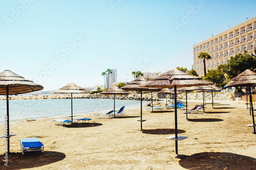 © kotina, Fototapeta premium Sunshade Umbrellas with lounge chairs on the beach