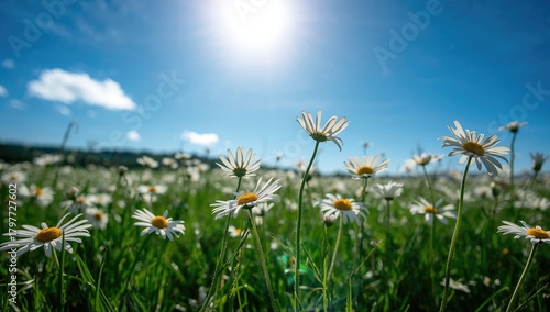 Obraz premium Sunshine and blue skies illuminating white daisies, seasonal change
