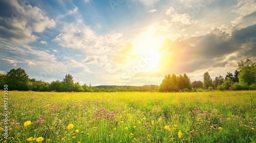 Obraz premium Sunshine breaking through the clouds over a blooming meadow, mixed weather, renewal