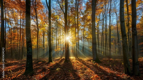 Obraz premium Sunshine filtering through the trees in a fall forest