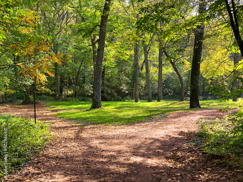 Fototapeta premium sunshine footpath forest hiking trail nature hikers adventure path shadow shade hike walkway crossroads