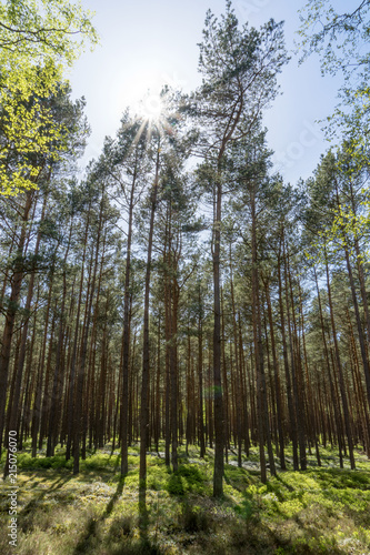 Obraz premium Sunshine forest trees. Sun through vivid green forest. Forest in light