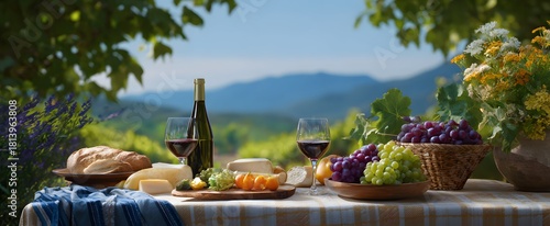 Naklejka premium Sunshine heats a vineyard table loaded with fresh eats and wine bottles