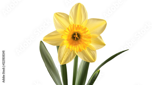 © yeewa, Fototapeta premium Sunshine in Bloom: A single, vibrant yellow daffodil blossoms with delicate petals and a bright orange center, radiating a sense of joy and hope. The flower stands tall against a clean background.