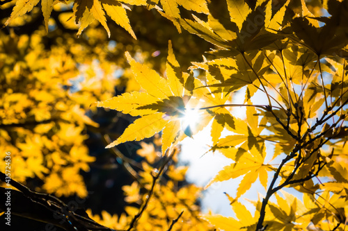 © Greg Brave, Obraz premium Sunshine with flare through fall leafs on blurred background