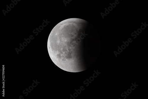 © lukszczepanski, Obraz premium Super Bloody Moon, full eclipse last phase against black sky background, one third of the Moon surface covered by Earth's shadow