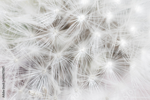 Obraz premium Super macro close-up of dandelion fluff. Abstract close-up of dandelion seeds background. Macro shot of detailed dandelion flower seed in natural environment. Soft selective focus