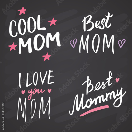 Obraz premium Super mom, Calligraphic Letterings signs set, printable phrase set. Vector illustration on chalkboard background